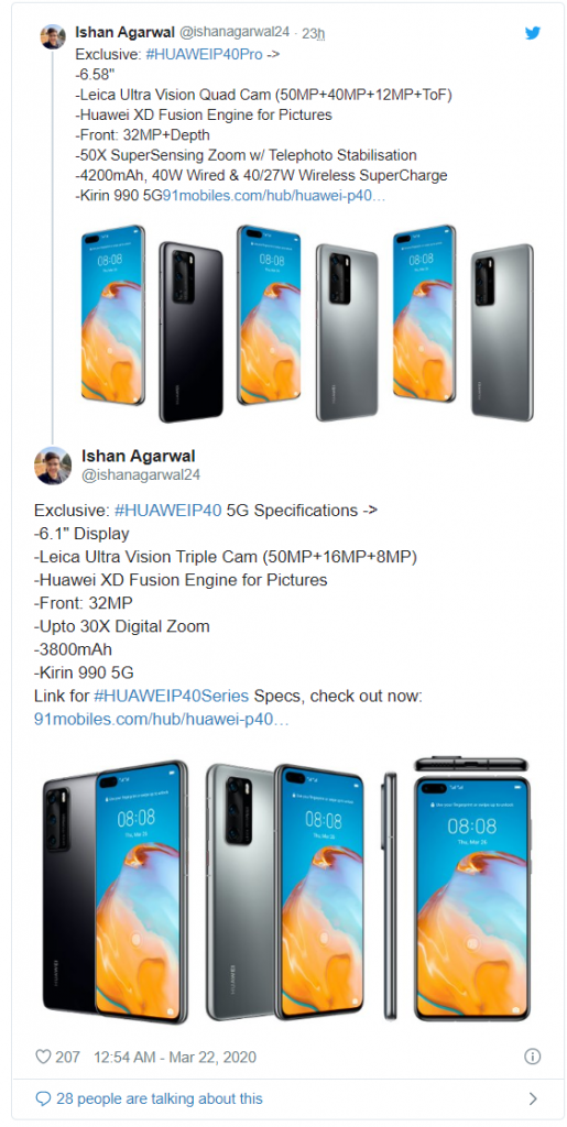 但就在新旗舰即将亮相的关头,知名的智能手机消息人士 @Ishan Agarwal 在线曝光了华为 P40 系列的详细规格。根据泄漏的信息,华为 P40 5G 将配备 6.1 英寸双打孔显示屏、 32 MP 自拍相机和 3800mAh 电池。该智能手机将采用麒麟 990 5G 芯片组。它还将配备三相机设置,其中包括一个 50 MP 主相机以及一个 16 MP 和 8 MP Leica Ultra Vision 传感器。