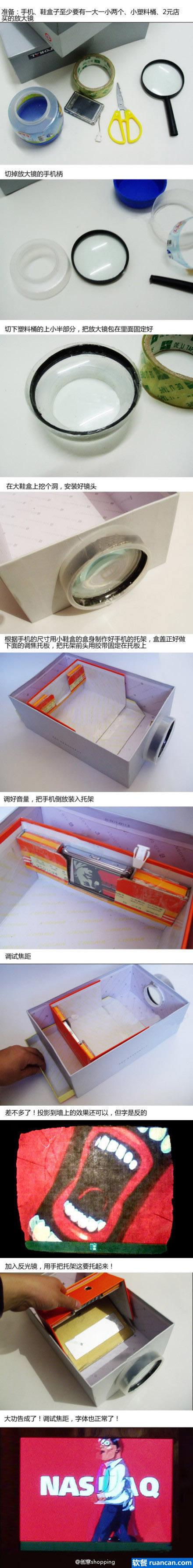 这个廉价投影机用到的材料也足够 “? 丝”,一部支持视频播放功能的手机,这个相信你再? 丝也拥有;一个放大镜,采购自十元店,这是? 丝们爱逛的地方;两个鞋盒,一大一小;小塑料桶和透明胶带。当然,你还必须要有一面干净的墙。具体的制作过程参考下图。