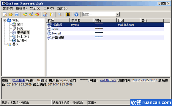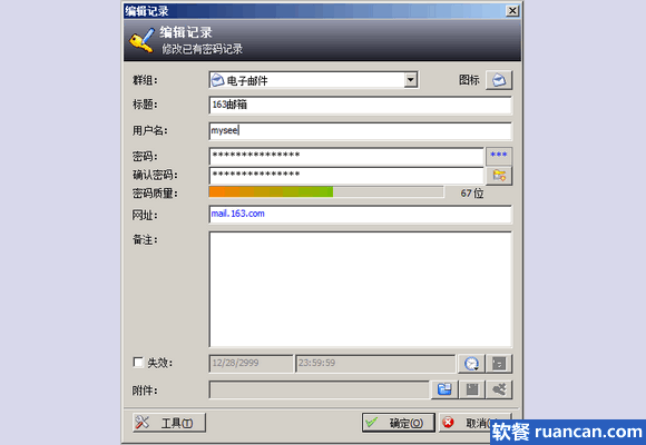 需要注意的是这里的 “用户名” 一项,如果你的邮箱地址是 mysee@163.com ,那么用户名应该输入 “mysee” 。在 “密码” 一项,KeePass 已经为我们自动生成一组密码,如果你不希望使用这组密码,按一下键盘上的 shift+home 键,一键清除这个密码,然后键入你自己的密码。接着在 “网址” 一栏键入邮箱的地址:mail.163.com 。保存后,一个网站的账户信息记录就创建好了。