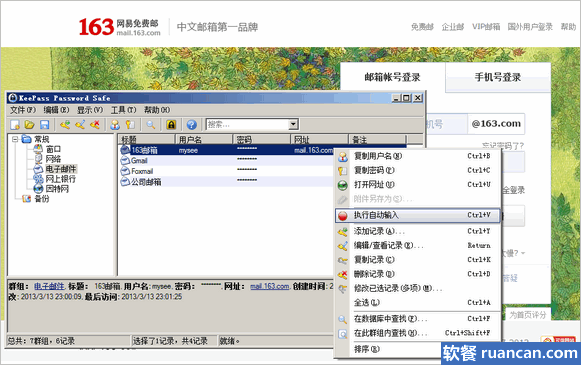 我们来做一下测试,看看 KeePass 是如何工作的。首先选中我们刚刚创建的 163 邮箱账户,鼠标右键选择 “打开网址”,浏览器将自动打开并访问 163 邮箱(mail.163.com);接着再点鼠标右键,选择 “执行自动输入” 。
