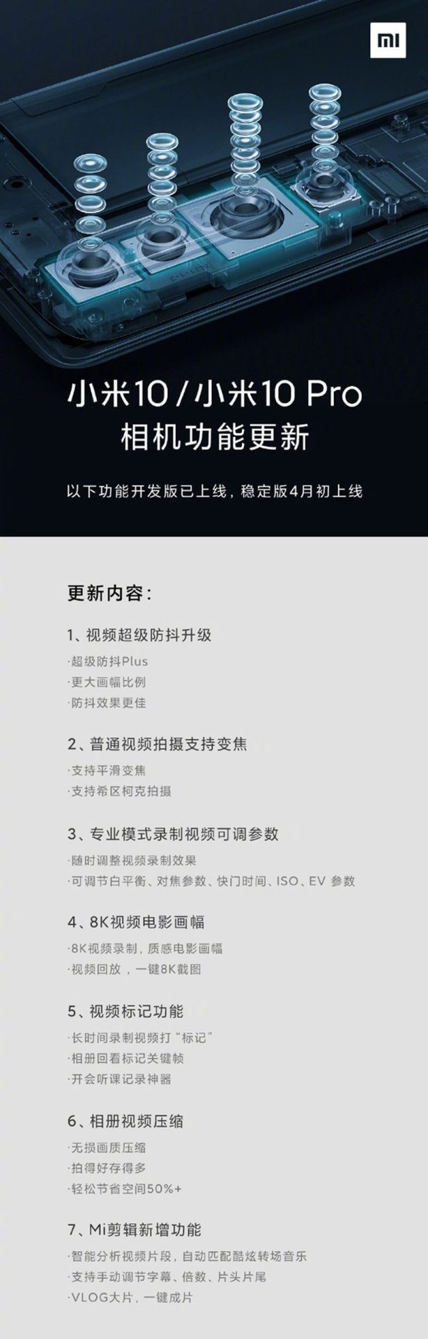 3 月 26 日,小米官方正式宣布小米 10/小米 10 Pro 系列机型迎来全线的相机更新 OTA 升级包。此次相机更新的内容包括:视频超级防抖升级为超级防抖 Plus 、普通视频拍摄支持变焦、专业模式录制视频可调参数、 8K 视频电影画幅、视频标记功能、相册视频压缩、 Mi 剪辑新增功能等。