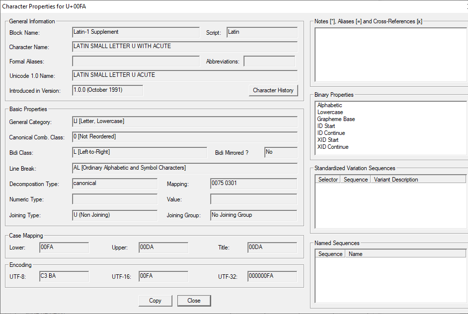 当选择了特定字符时,应用程序将显示信息。这包括属性和其他信息,例如其 Unicode 名称和编码信息。