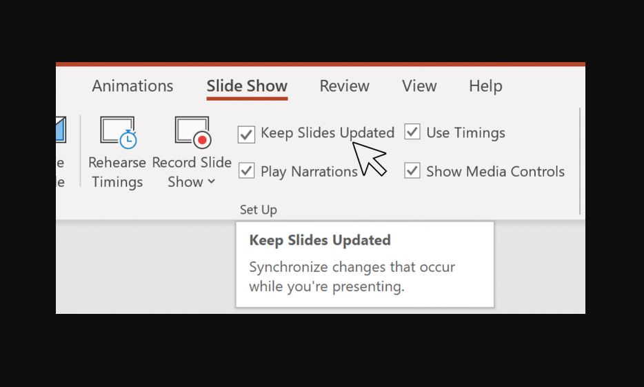 - 选择 功能区 上 “ 幻灯片放映” 选项卡上的 “ 保持幻灯片更新” 复选框 。