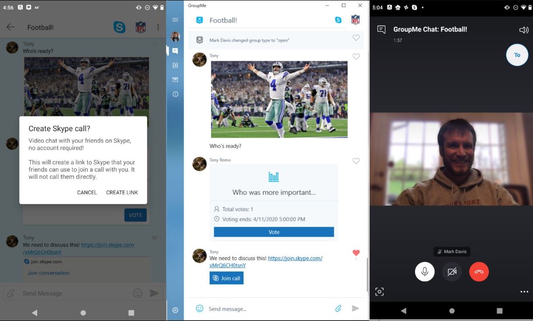 新版本已支持群组聊天内创建 Skype 群聊视频通话。用户可以在 GroupMe 群组聊天窗口中单击以创建 Skype 群组视频通话。当您点击聊天窗口顶部的 Skype 图标时,系统会询问您是否要创建 Skype 通话链接,点击 “创建链接” 后,Skype 视频聊天链接将发布在聊天中。群组中的任何人都可以点击链接并加入视频通话,主要亮点是使用此功能不需要 Skype 帐户。