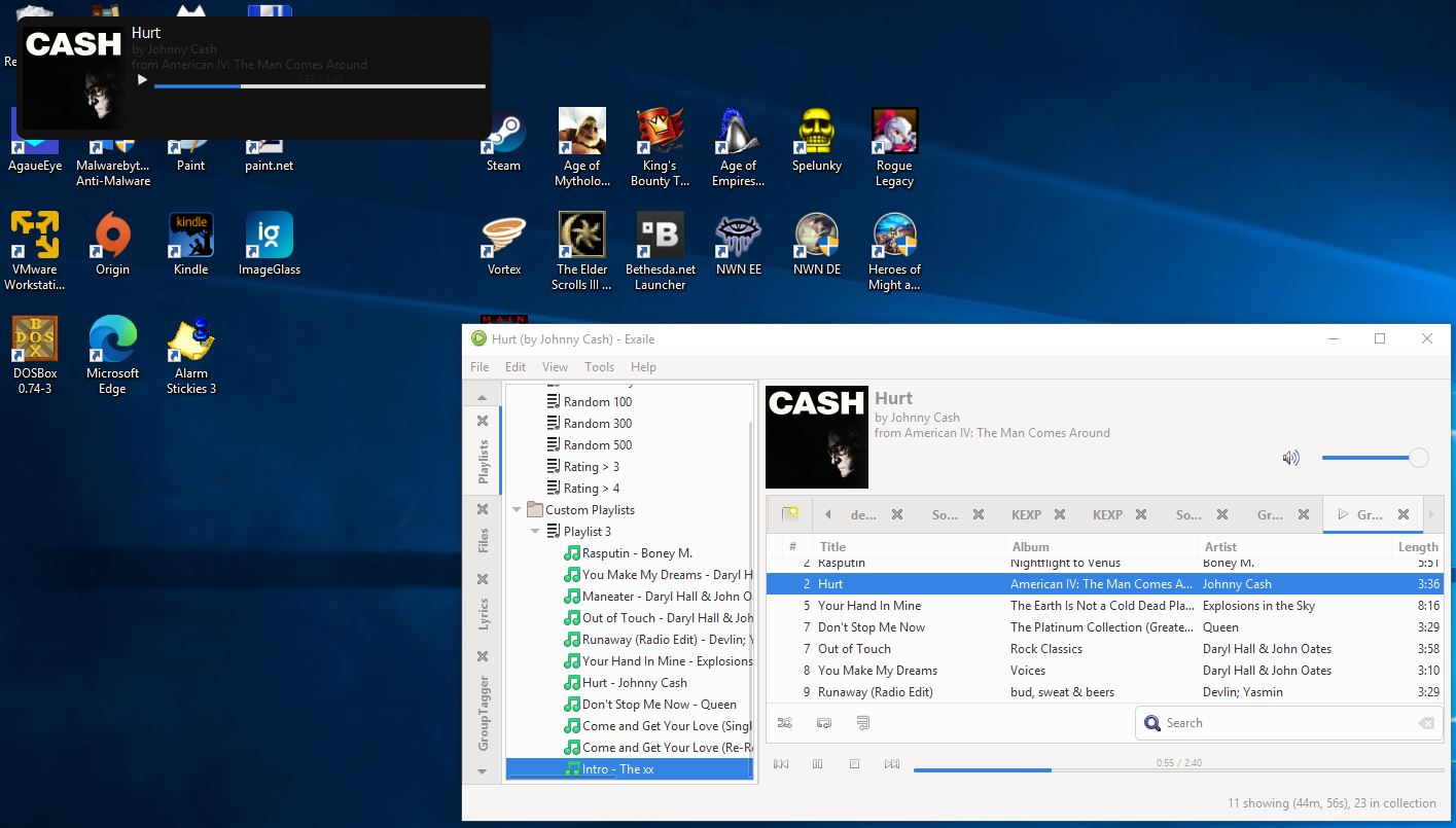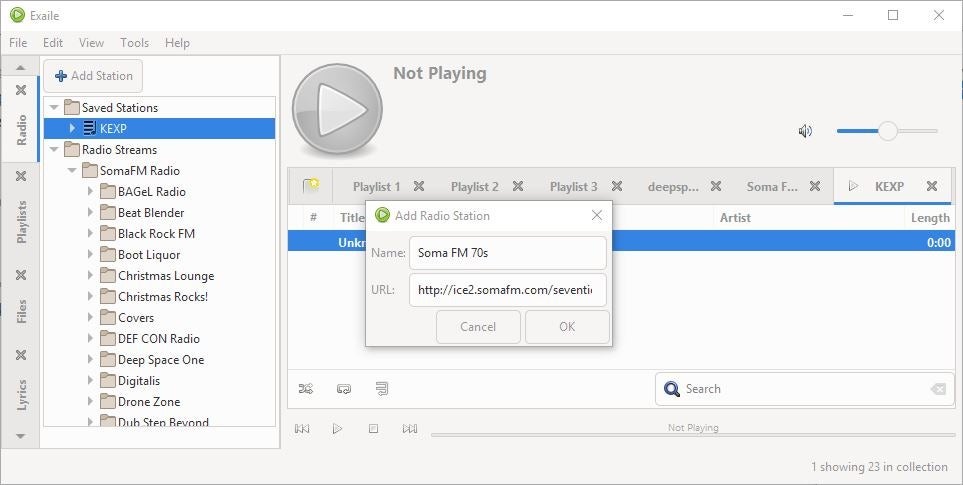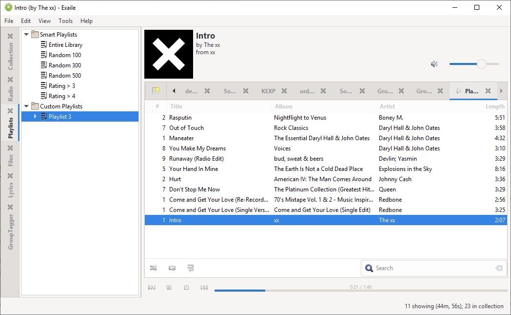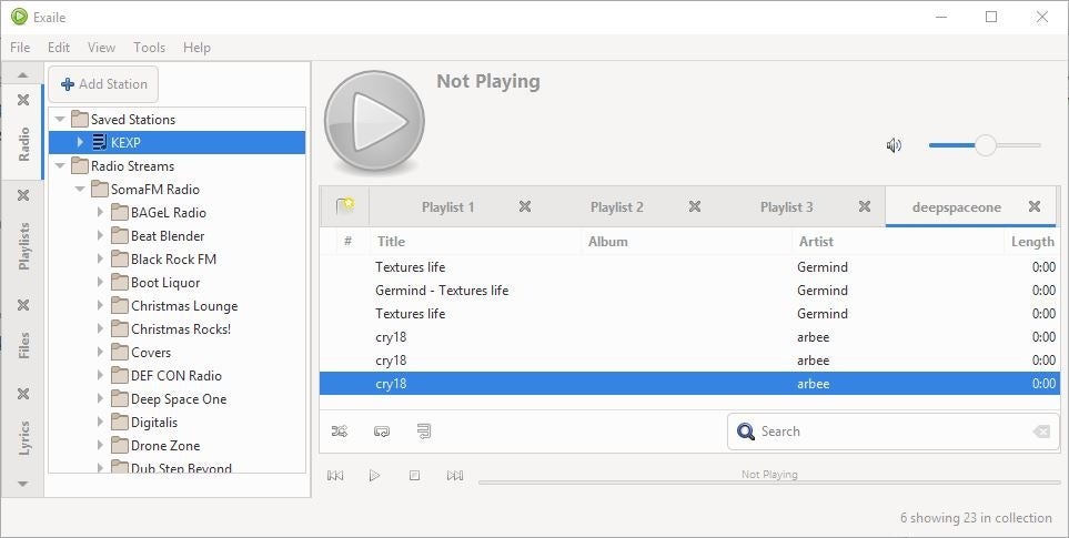 Exaile 音乐播放器支持播放列表选项卡,使您可以在它们之间轻松切换。播放控件可让您随机播放、重复、暂停、播放、跳至上一首和下一首曲目。 “文件” 菜单可以将播放列表保存为 M3U 格式、打开音乐文件夹、导入播放列表。 “打开 URL” 可直接播放带有音乐流媒体的链接。