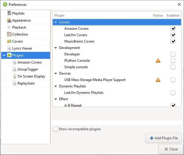 Exaile 的主要亮点之一是它支持插件。该程序附带许多附件,尽管默认情况下大多数附件都是禁用的。启用您想要向音乐播放器添加一些其他功能的功能,例如自动获取专辑封面、 Last.fm 中的动态播放列表、 AB 重复、均衡器,重播增益等。