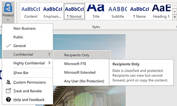 如果您的组织在Microsoft信息保护中设置了“敏感”标签,并允许用户分配权限,则可以访问它们。例如,选择“ 主页”>“保护”, 然后选择要应用于文档,工作簿,演示文稿或电子邮件的标签。