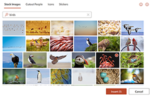 Office 365 订阅者现在可以轻松地在 Excel,Word,Outlook 和 PowerPoint 中向其个人或专业文档,文件和演示文稿中添加高质量的精选图像,贴纸和图标。从 8,000 多种免版税图片和图标中搜索,还有更多!