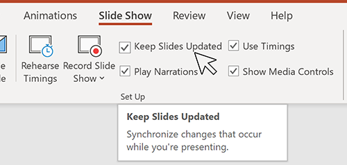 多年来,PowerPoint 不允许在演示时显示其他人对幻灯片所做的更改。但是,尽管有些演示者可能仍希望使用此设计,但我们从其他人那里听说他们正在寻求更大的灵活性。我们很高兴能够在每次进行更改时都提供同步更改的功能,即使演示文稿处于幻灯片放映模式也是如此。