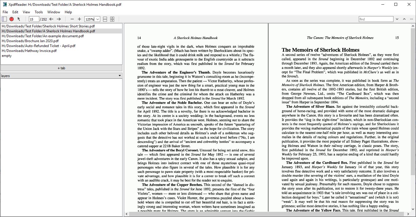从界面上看,XpdReader 界面的左上方面板是选项卡面板,单击 “ +选项卡” 按钮可打开一个新文件。只需单击一下即可在任何打开的文档之间切换。或者,您可以使用 “在新窗口中打开” 选项来打开程序的多个实例。窗口菜单可用于管理打开的窗口和选项卡,例如,如果您要关闭一个窗口和选项卡。左侧的另一个面板用于查看 PDF 中的分层内容和书签。