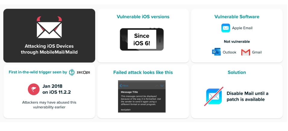 - 如果攻击者控制邮件服务器,则可以触发对 iOS 12 的无人协助攻击(也称为零点击)