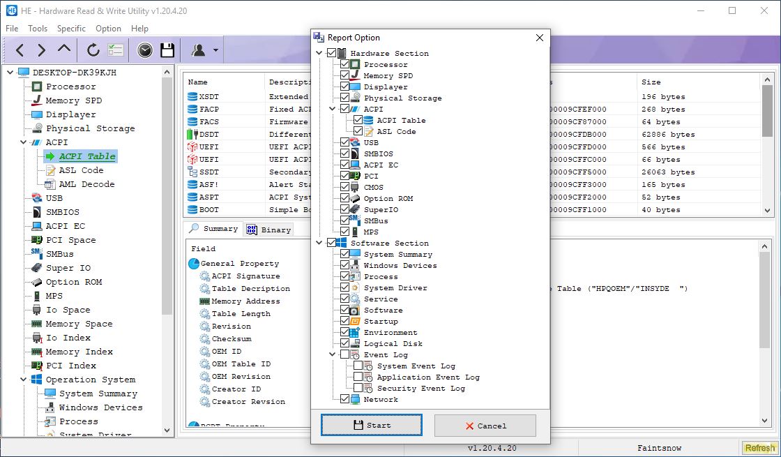 HE – Hardware Read & Write Utility 界面顶部的工具栏可用于导航侧栏和刷新列表。通过单击纸张图标生成系统硬件的摘要。它将打开一个新窗口,以在内置查看器中显示报告。您可以阅读摘要、搜索关键字、放大或缩小。它以纯文本显示,也可以将其复制到文本编辑器中。