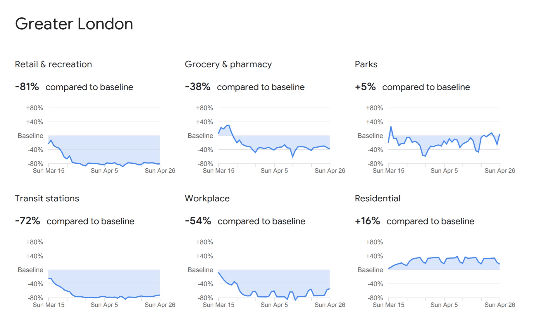 “社区流动性” 报告按地理位置绘制了一段时间内不同类别场所(如零售和娱乐场所、杂货店和药店、公园、中转站、工作场所和住宅)的人员流动趋势图。