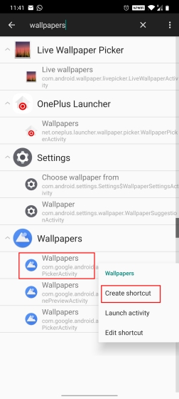 6. 安装后,打开 “Activity Launcher” 并搜索 “Wallpapers” 。现在,展开 “Wallpapers” 菜单,然后点击第一个选项。它应将您直接带到 “Wallpapers” 应用,从那里您可以轻松地在 Android 设备上访问和设置超级壁纸。