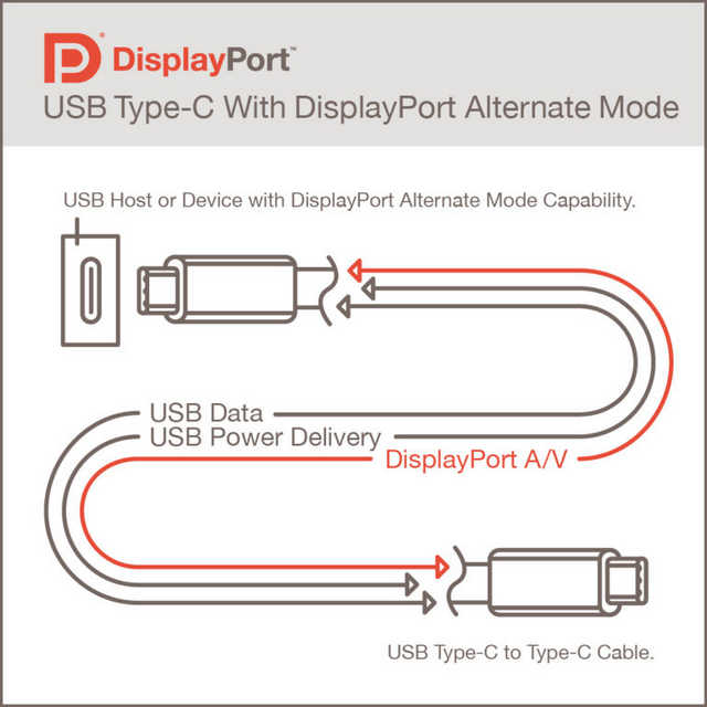 “在 DisplayPort 备用模式下,USB-C 连接器可以利用电缆中的所有四个高速通道传输高达 80 Gbps 的 DisplayPort 视频数据,或者在同时传输 SuperSpeed USB 数据的情况下高达 40 Gbps” 。 VESA 在新闻稿中表示。