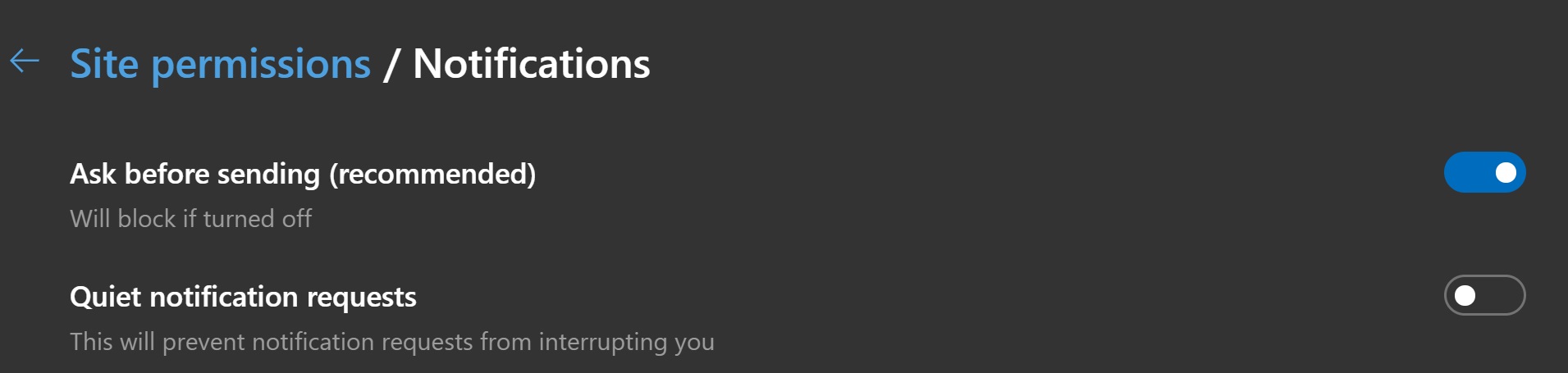 可以在 Chrome 的设置中手动启用该功能,并且该功能现在也已用于 Edge Beta 。要在 Edge beta(83 及更高版本)中启用该功能,请转到 “设置”>“网站内容”>“通知”,然后打开” 使通知请求静音” 开关。