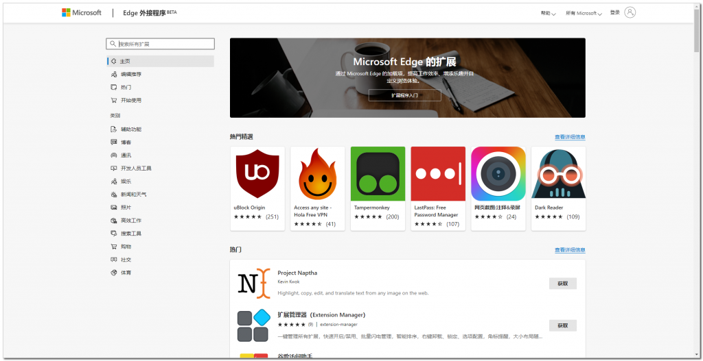 Edge 浏览器商店中文版名称被称为 “Edge 外接程序”。现在,该网站已经推出了全新布局,包括全新的 “编辑推荐” 和 “热门” 页面,以及扩展搜索框旁边的过滤器功能。这都旨在使用户更轻松地找到最适合的扩展。