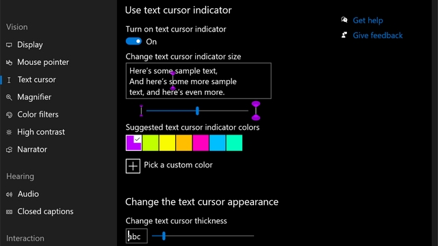 文本光标的最显著的改进是添加了文本光标指示器。这可以帮助有视觉障碍的用户轻松找到光标。该文本光标的大小可以调整自己的喜好调整。微软增加了更改光标粗细的功能,并带有颜色选择器,可以在屏幕上快速找到光标。您还可以为文本光标选择自定义颜色。