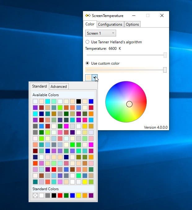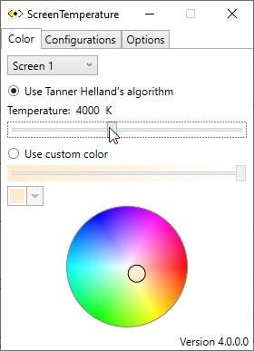 “颜色” 选项卡有两种调整色温的方法。第一个选项使用 Tanner Helland 的算法(Photo Demon 的开发人员)。该算法用作 ScreenTemperature 中的默认方法。该页面上的滑块可以向左拖动以降低温度,您可以将其向右移动以增加温度。滑块上方的文本以 K(开氏温度)为单位显示当前温度值。