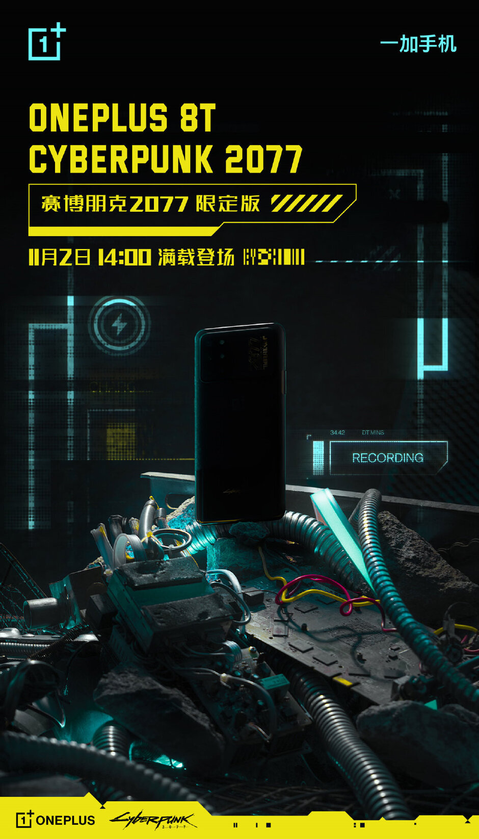 软餐获悉,一加 8T Cyperpunk 2077(赛博朋克 2077)特别版将在 11 月 2 日正式发布。