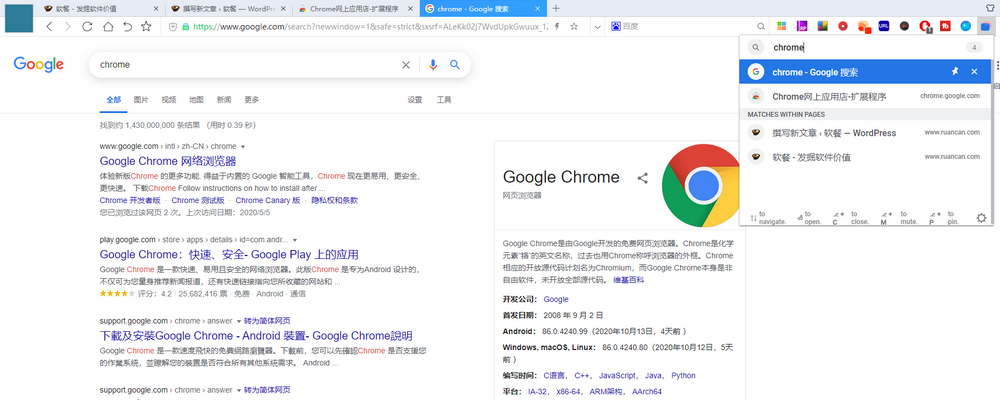 匹配标题或 URL 的选项卡显示在顶部,而匹配页面内容的选项卡显示在第一组的下方。