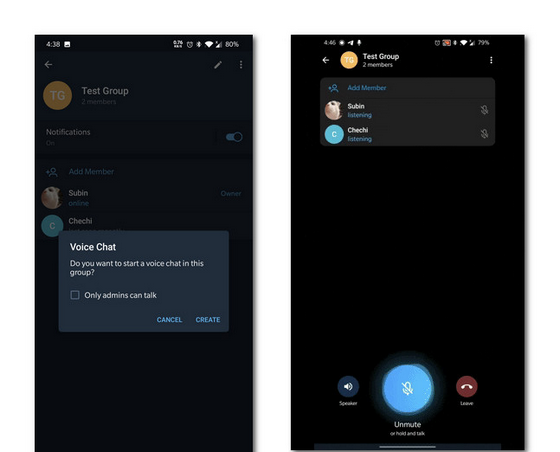 当您发起群组音频聊天时,支持仅管理员发言。这样其他参与者将只能倾听。此外,发起通话的选项仅限于管理员。加入通话后,默认情况下您将处于静音状态。您可以取消静音按钮或按住麦克风按钮讲话。