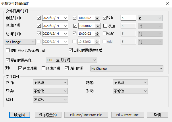 在弹出的时间/属性设置窗口,即可设置新的文件创建时间、修改时间和访问时间,BulkFileChanger 允许你在时间后加减时间。你可以灵活的设置修改范围,精确到秒。甚至还提供了复制修改的选项(即 “复制时间来自 xx 到 xx” 选项),例如,你可以将文件的修改时间改为和创建时间一致。