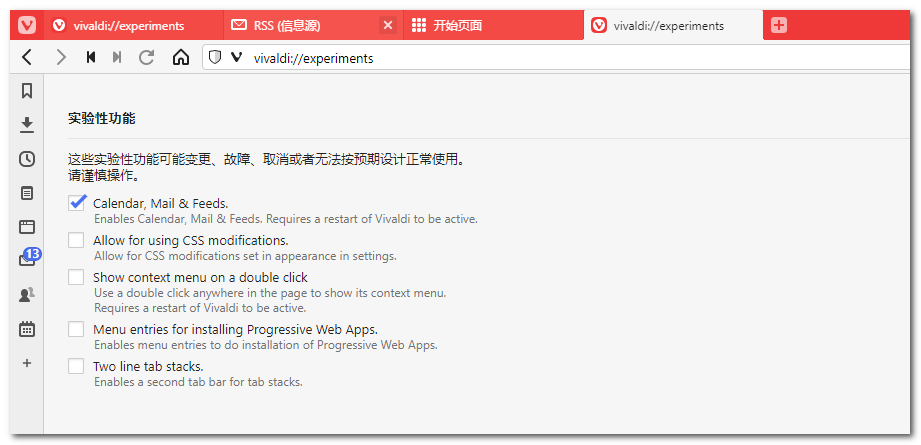 软餐(ruancan.com)发现,要使用这一功能,需要首先开启快照版上的 RSS 功能(访问 vivaldi://experiments/,打开如下图示选项。)