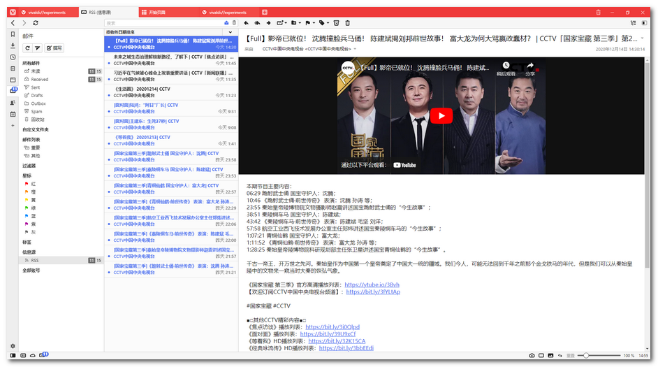 订阅之后,当被订阅频道有新的更新内容,用户会在 Vivaldi 侧边栏和状态栏上的消息图标看到未读通知,点击即可在 RSS 阅读器中查看最新内容,这样,你无需再打开 Youtube 官网,即可直接播放订阅的视频。