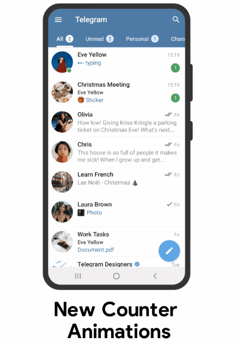 电报团队为 Android 版添加了新的动画效果,“新消息” 按钮、个人资料、聊天文件夹管理、消息计数器等多处都引入了全新的操作动画效果。
