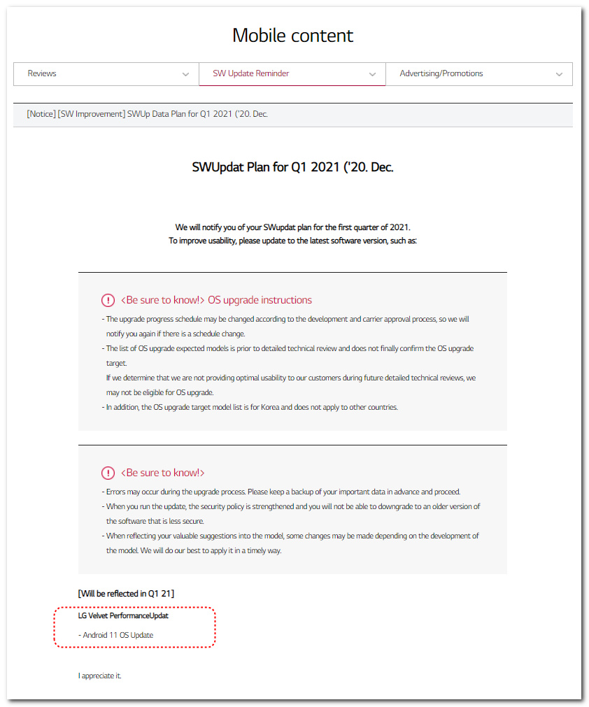 软餐(ruancan.com)获悉,近日 LG 宣布了 2021 年第一季度的 Android 11 升级计划。令用户遗憾的是,第一季度仅 LG Velvet 5G 一款设备会升级到 Android 11 。