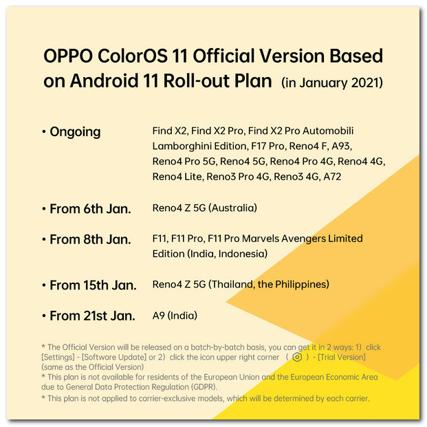 Oppo 发布的更新计划显示,当前正在接收 ColorOS 11 的稳定版的设备包括:Oppo Find X2,Oppo Find X2 Pro,Oppo Find X2 Pro 兰博基尼版,,Oppo F17 Pro,Oppo Reno 4F,Oppo A93,Oppo Reno 4 Pro 5G, Oppo Reno 4 5G,Oppo Reno 4 Pro 4G,Oppo Reno 4 4G,Oppo Reno 4 Lite,Oppo Reno 3 Pro 4G,Oppo Reno 3 4G 和 Oppo A72 。