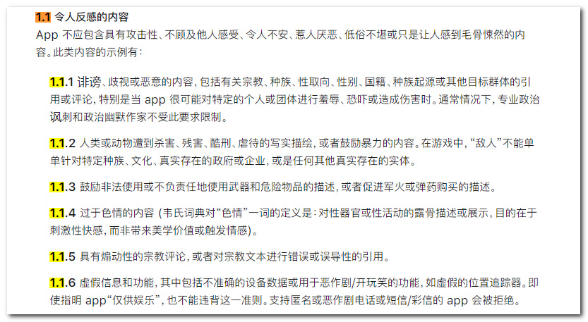 软餐(ruancan.com)查阅了《App Store 审核指南》,1.1 款的内容如下。