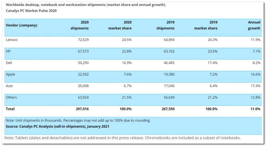 技术市场分析公司 Canalys 的数据显示,2020 年全球 PC 总出货量增长了 11%,达到 2.97 亿台。