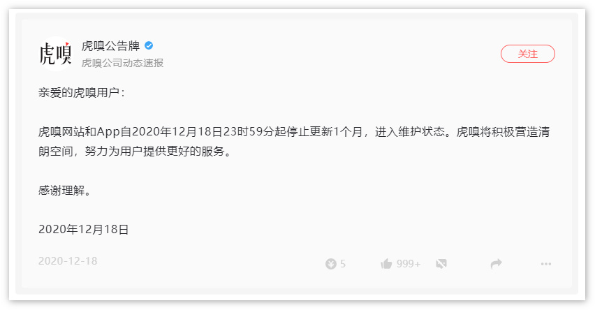 2020 年 12 月 18 日,虎嗅网发出公告,宣布将从当日起停止更新 1 个月。