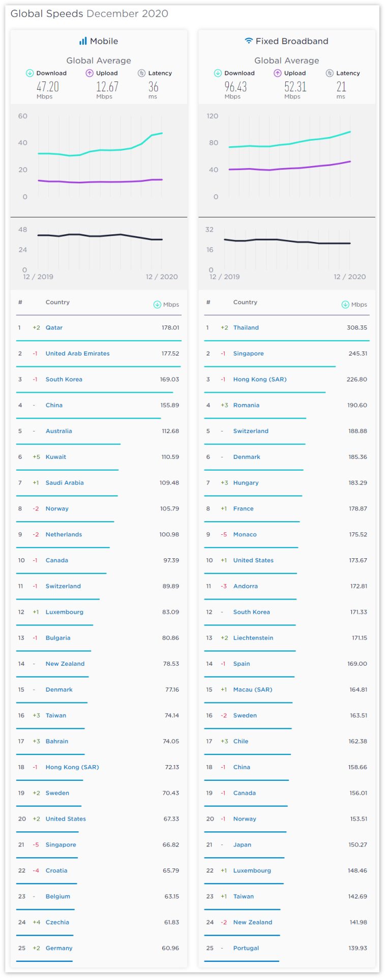 以下是 2020 年 12 月全球网速排行完整榜单(前 25 位)。