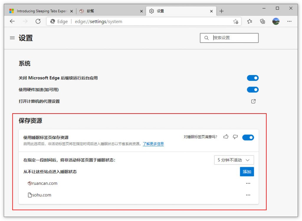 该功能在 Edge 正式版上为默认开启,默认为 2 小时后,不活动的标签页将被自动置为睡眠状态。