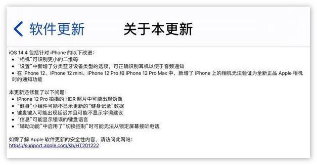 另外,iOS14.4 正式版还修复了部分 iPhone 在健身小组件中不显示更新数据的问题。针对 iPhone12Pro 在拍摄 HDR 照片中可能出现的 “伪像” 也作出了修复。遗憾的是,我们在这个版本更新中没有等到绿屏、续航下降、发烫等问题的修复。