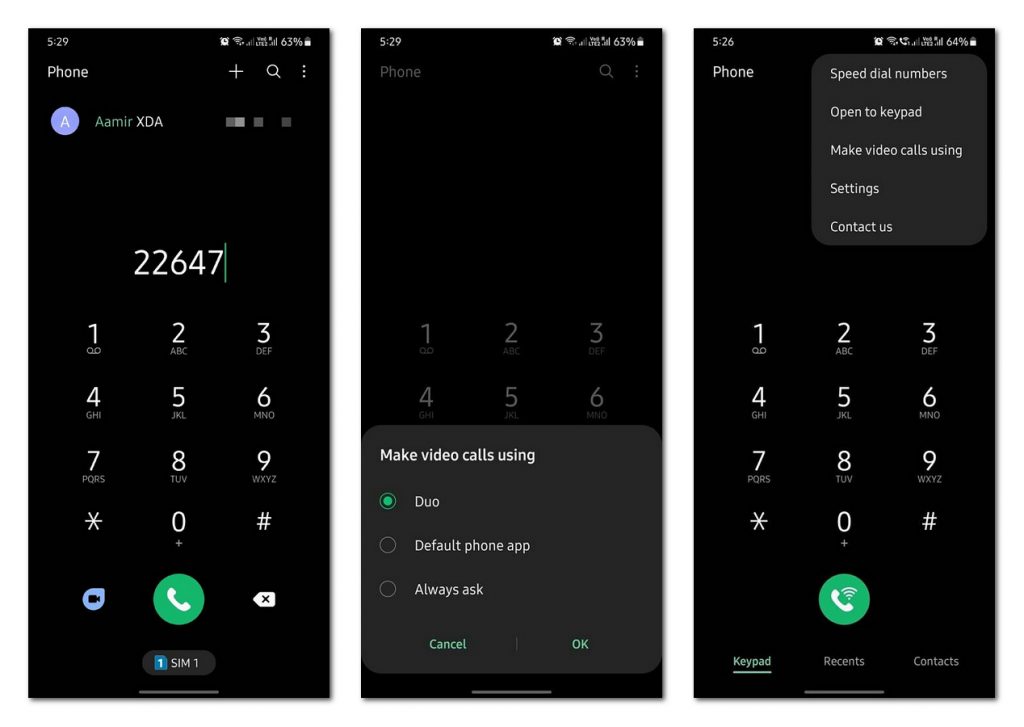 三星与谷歌合作,在 One UI 3.1 中对 Google Duo(谷歌的视频聊天应用)进行了无缝集成。三星在拨号应用的菜单中新增了菜单(下图),除了默认的电话应用,还允许用户将 Google Duo 设置为视频通话的首选项。