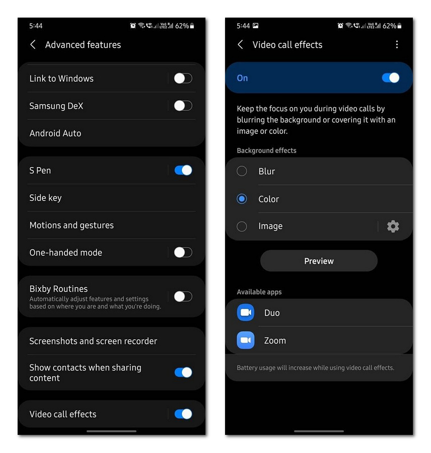 One UI 3.1 上还引入了视频通话效果(Video call effects)。它可以在用户视频通话时自动添加酷炫的背景效果。