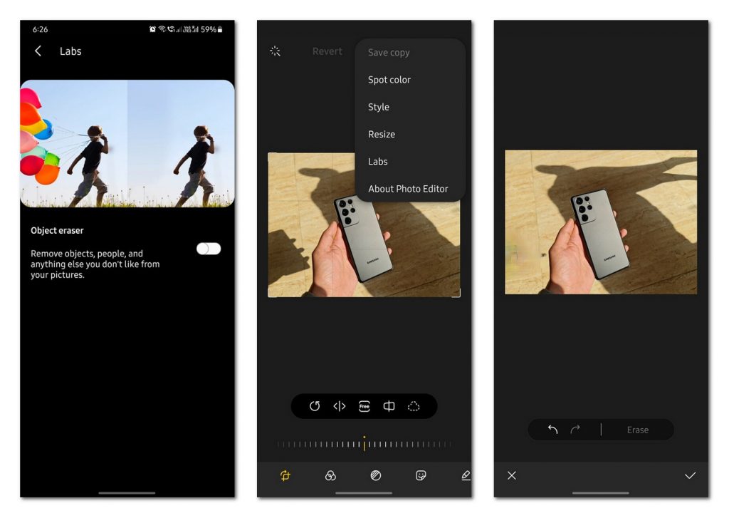 使用 One UI 3.1 中的相册(Gallery)应用程序编辑照片时,用户可以点击 “Object Eraser”(对象橡皮擦)按钮,从照片中删除选择的对象。这在处理照片中的无关的背景人物、物品时十分实用。