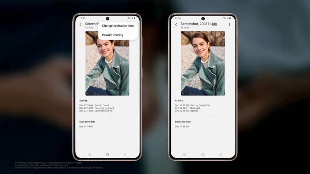 三星在 One UI 3.1 上推出了全新的文件共享应用 Private Share,该功能已经出现在 Galaxy S21 上。通过 Private Share 应用程序,用户可分享图片、视频和文档等文件,Private Share 将使发送者为分享的文件设置一个有效期,有效期满后,文件将自动从收件人的设备中删除。用户可以随时手动撤消分享,也可等待分享自动过期。