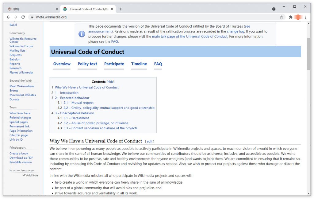 这项准则由管理维基百科的非营利组织维基媒体基金会(Wikimedia Foundation)发布,该基金会对现行的准则进行了扩展,以创建一套社区标准来对抗 “负面行为” 。