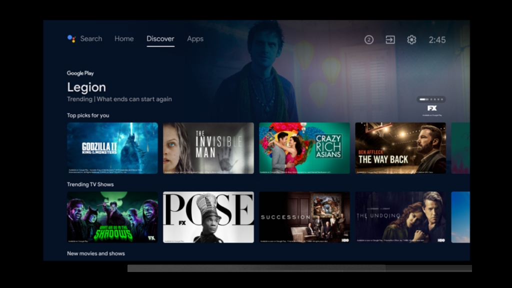 “发现” 标签会根据用户的活动提供个性化内容的建议和来自 Google 的热门内容。与 “首页” 标签类似,“发现” 标签包括几个部分,显示来自所有应用程序和订阅的电影、电视节目和电视直播节目推荐。它有 “为你推荐的精选节目” 、 “流行电视节目” 和 “新电影和节目” 板块。