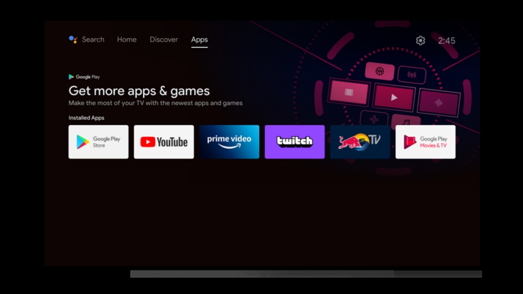“应用程序”(Apps)标签则展示所有已安装的应用程序。与 Google TV 不同,它不会显示 Google Play 商店中的推荐应用。