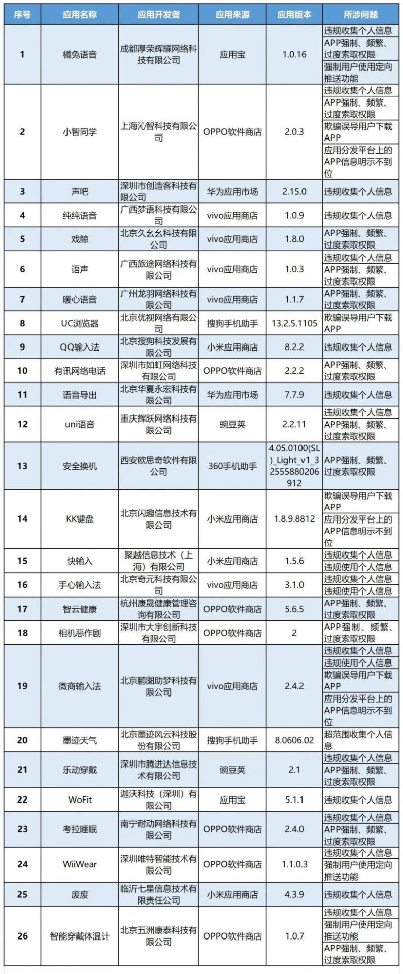软餐发现,UC 浏览器、 QQ 输入法、手心输入法、墨迹天气等几款来自知名厂商的应用程序也出现在通报列表中。
