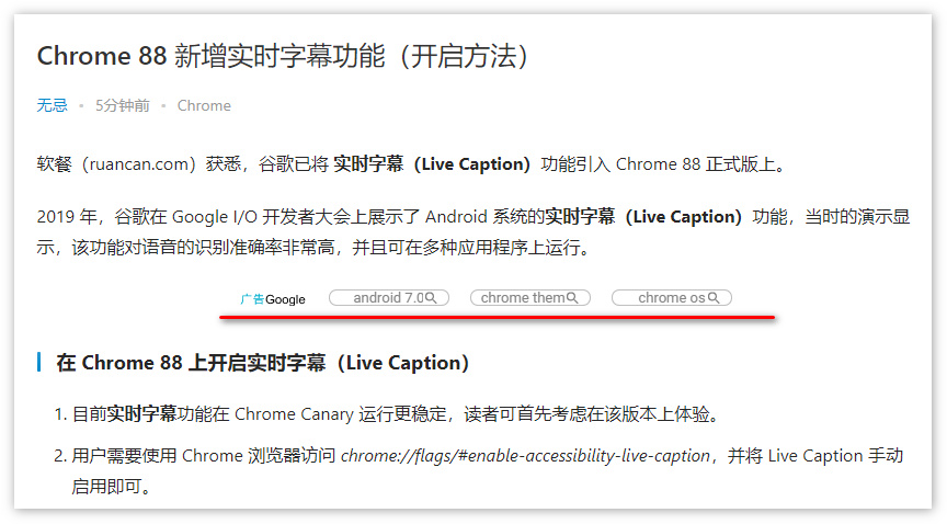 以软餐(ruancan.com)为例,我们在文章正文中嵌入了少量的链接广告。(下图)