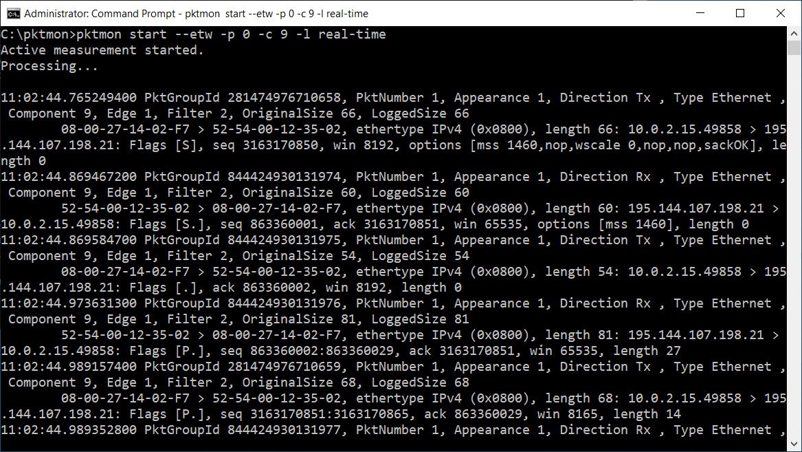 在 Windows 10 2004 中,微软为 Pktmon 添加了两个附加功能:实时查看嗅探到的数据包并将 Pktmon 日志转换为 PCAPNG 支持。在该版本的 Pktmon 中,用户可使用-l real-time 参数启用实时监控。