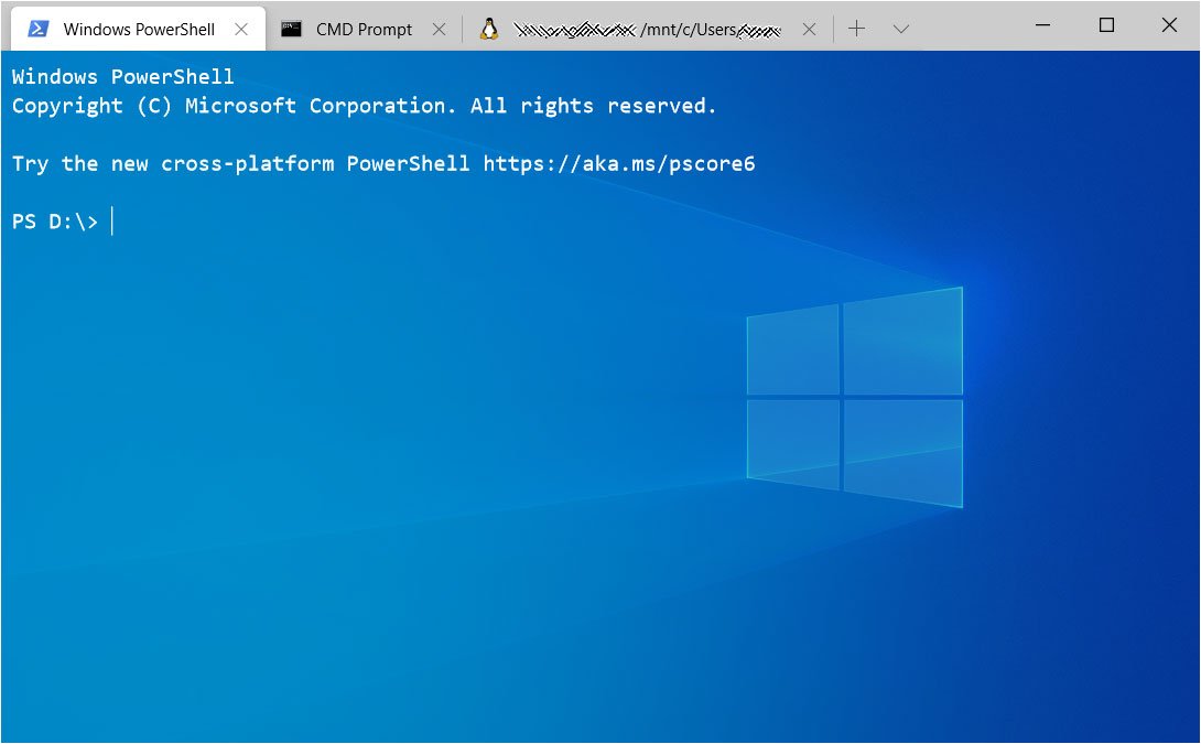 例如下图,Windows Terminal 可开启一个 PowerShell 控制台标签页、一个带有 Windows 10 命令行标签页和一个 WSL Ubuntu Shell 标签页。