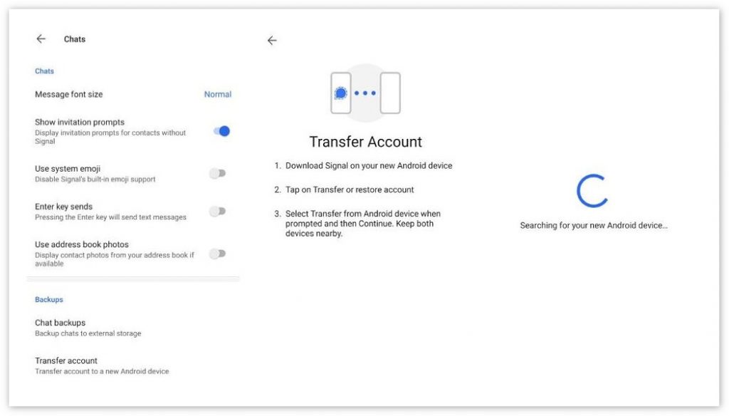 要迁移 Signal 聊天记录,请转到“设置” >“聊天” >“转移帐户”,Signal 会展示一个全新界面来引导用户进行迁移。